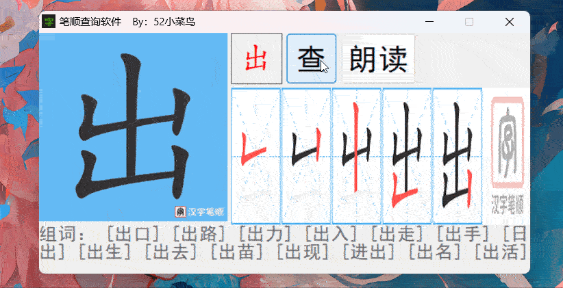 字眼查是吾爱大佬开发的一款多功能汉字工具,软件小巧只有876KB,能查询汉字笔顺、书写动画演示、在线组词、朗读拼音等。